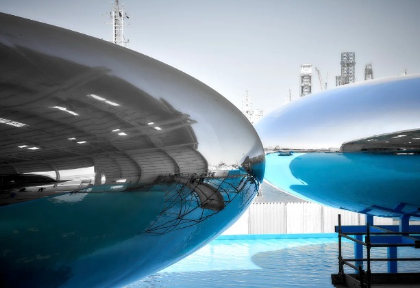 A escolha técnica foi o AISI 316L, pois conta com a adição de molibdênio. Na prática, isso cria uma barreira química contra o temido pitting (a corrosão por pites) causada pelos íons de cloreto da maresia. Como as orbes são curvas e exigiram muita soldagem, o “L” (de low carbon/baixa carbono), evita a precipitação de carbonetos, garantindo que as emendas não se tornem pontos de oxidação no futuro.