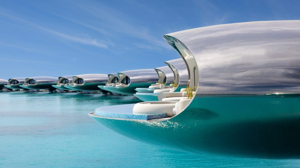 E sejamos sinceros, o resultado visual beira a poesia: vistas de longe, as vilas parecem pérolas gigantes repousando sobre as águas turquesa do Mar Vermelho. Essa semelhança não é coincidência; o design buscou inspiração direta nas pérolas que historicamente eram a base da economia da região. Graças ao brilho e à curvatura impecável do inox, o resort entrega uma estética orgânica que flutua entre o natural e o futurista, transformando metal bruto em uma joia arquitetônica que parece brotar do oceano.