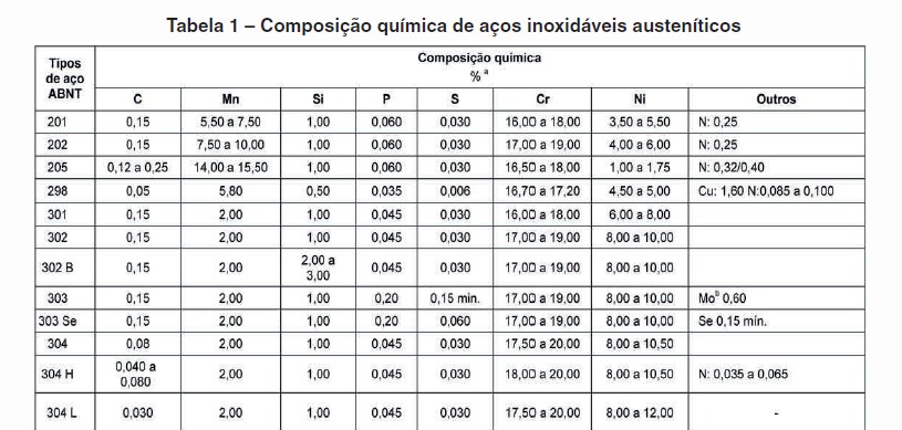 A norma organiza os aços inoxidáveis em cinco classes principais, de acordo com suas características químicas e propriedades: